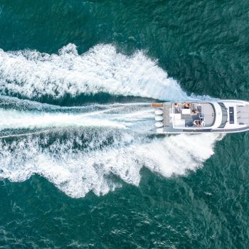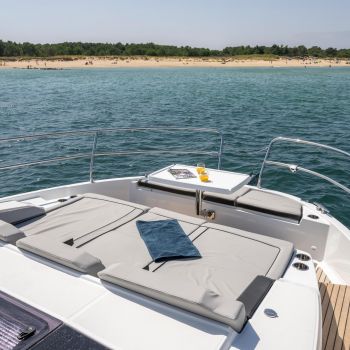 Die Flybridge ermöglicht ein Steuern und gleichzeitig ein Genießen der Sonne und der Gischt durch einen separaten Steuerstand. Sie bietet bugseitig ein Sonnendeck und eine klappbare Doppelbank. Die Bank lässt sich je nach Wunsch in einen Liegestuhl oder ein XXL-Sonnendeck umwandeln!